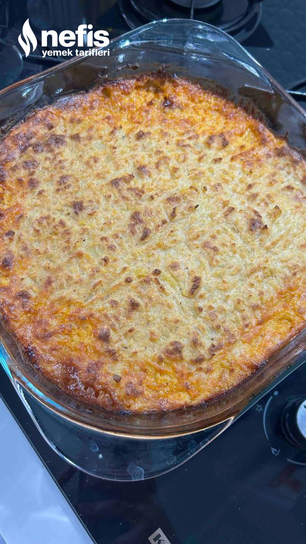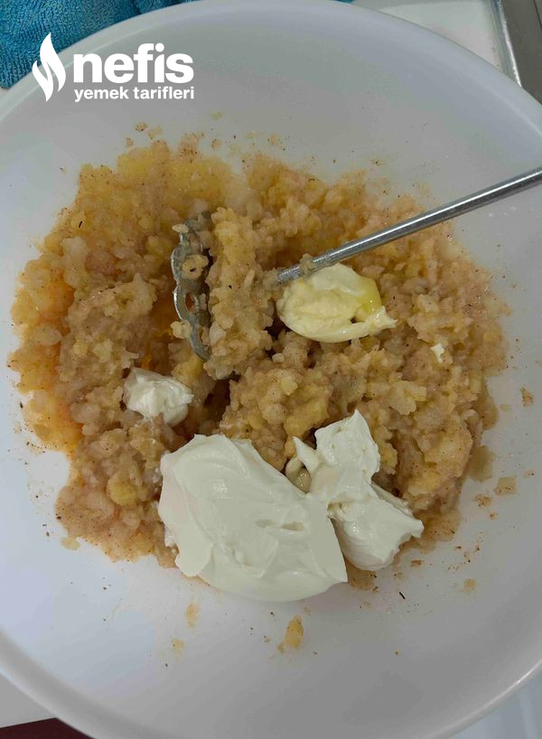 15. Üzerine püre haline getirdiğimiz patatesi dökelim ve güzelce yaydıralım.