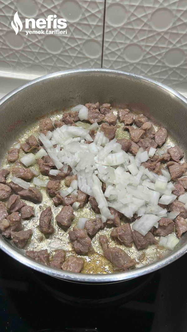 7. Suyunu çeken kavrulmaya başlayan etlerimizin üzerine soğanlarımızı ek edelim.