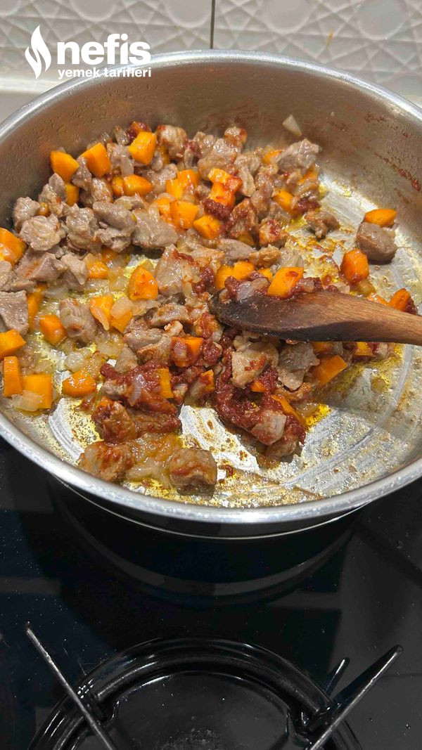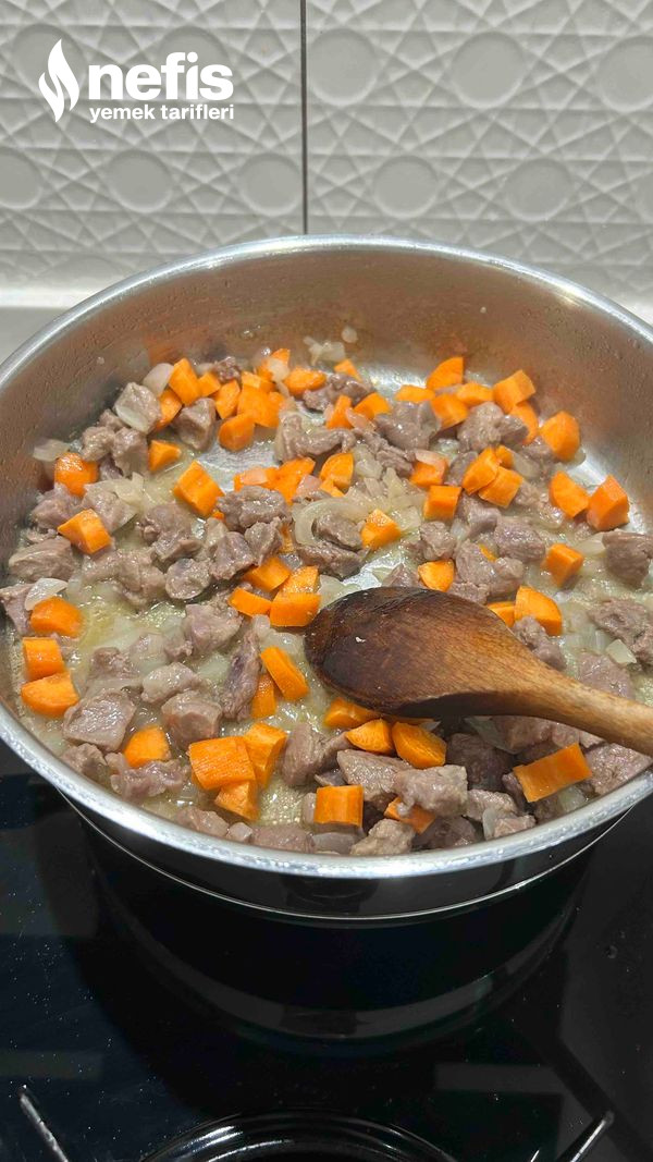 8. Soğanlarımız kavrulduktan sonra havuçlarımızı ek edip 3 dakika daha kavurma sürecini yapalım.