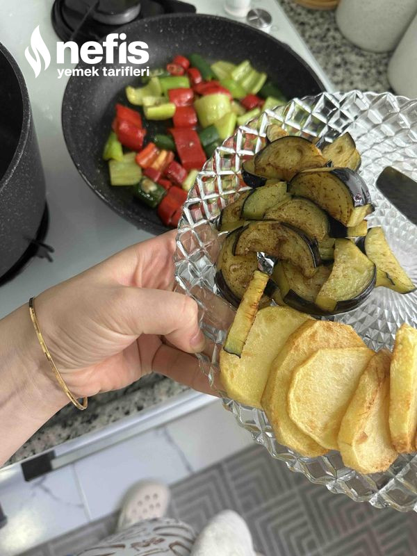 - Ardından patlıcan, patates, biberleri doğrayıp kızarıyoruz.