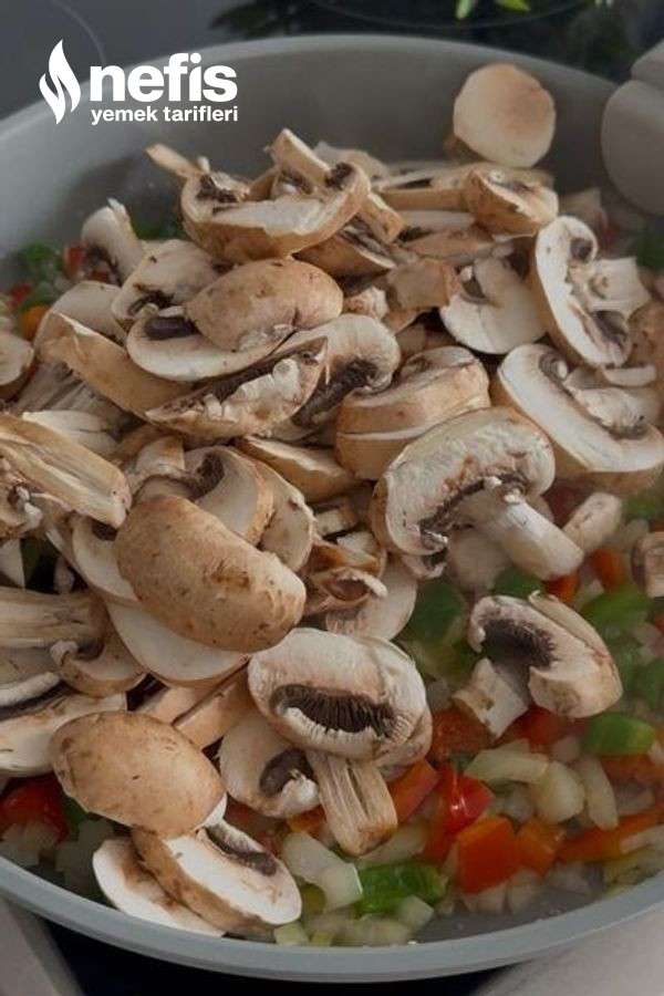 3. Sonra mantarları ekleyip, mantarlar suyunu çekene kadar pişirmeye devam edelim.