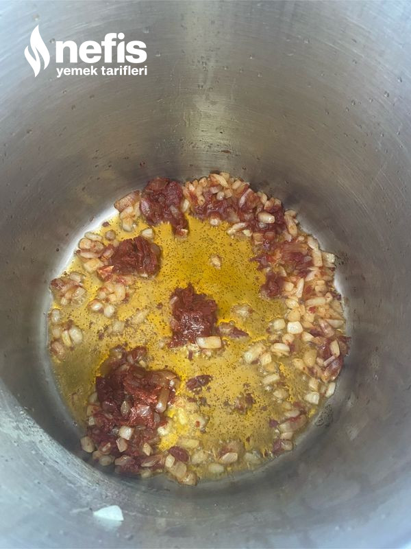 3. Pembeleşen soğanlarım üzerine salçamızı ekleyelim, biraz soğanları ve salçalı kavuralım.