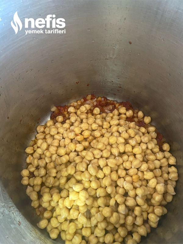 4. Kavurduğumuz soğan ve salçanın üzerine nohutları ekleyelim onu da biraz kavuralım. (1-2 dk).