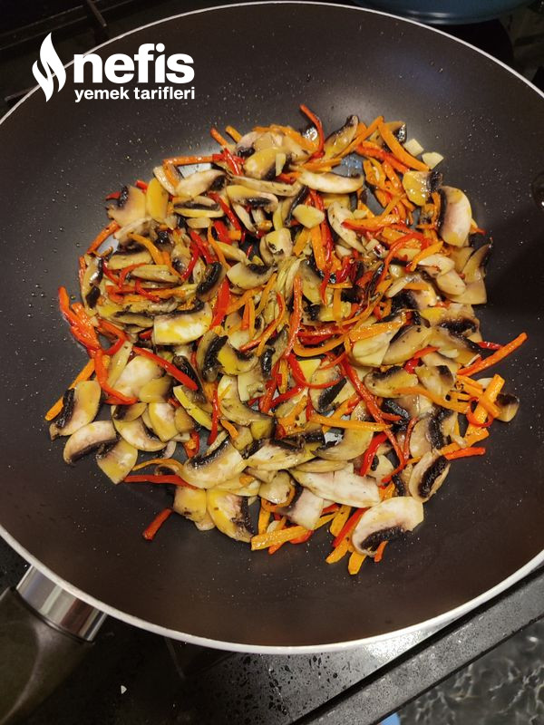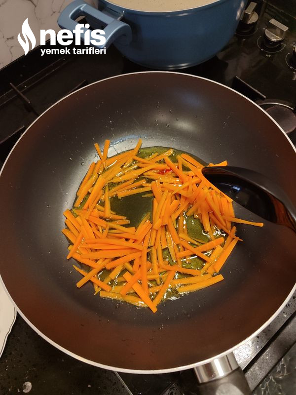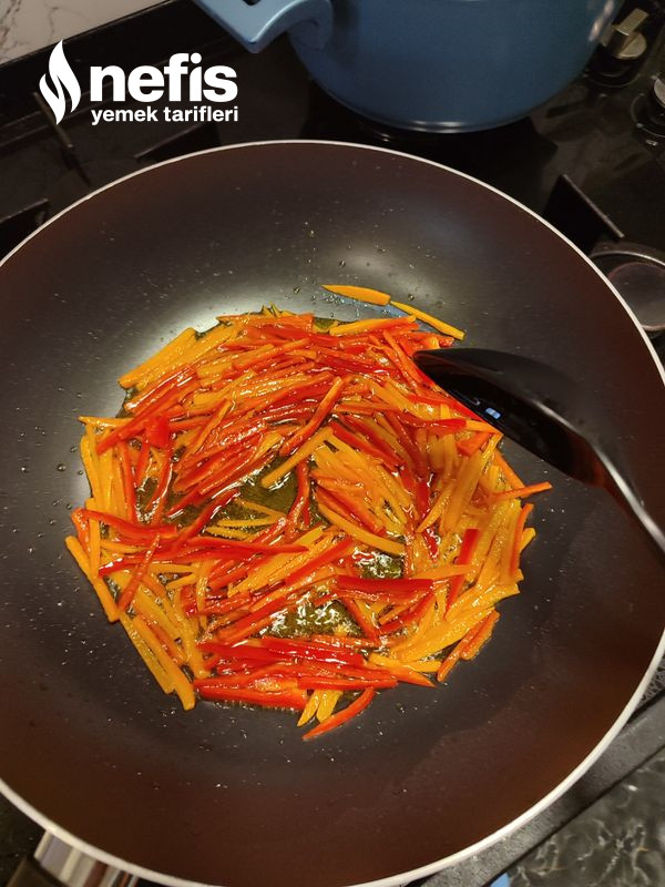 4. Etimiz pişerken ya da piştikten sonra zeytinyağı döktüğümüz tavamıza (ben wok tava kullandım) evvel havuçları koyalım ve 7-8 dakika kavuralım rengi dönmeye başladığında kapya biberlerimizi ekleyelim.