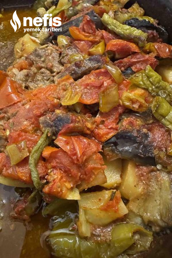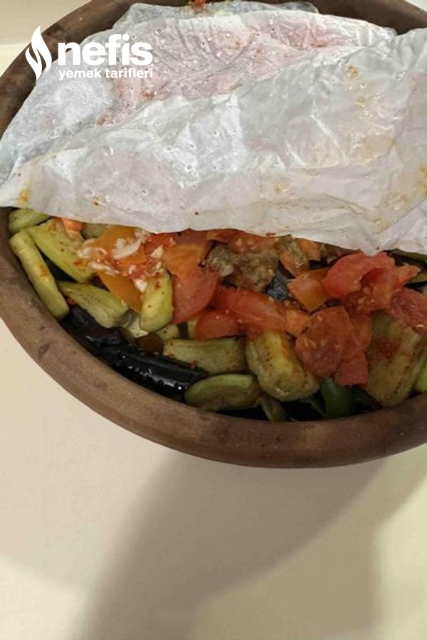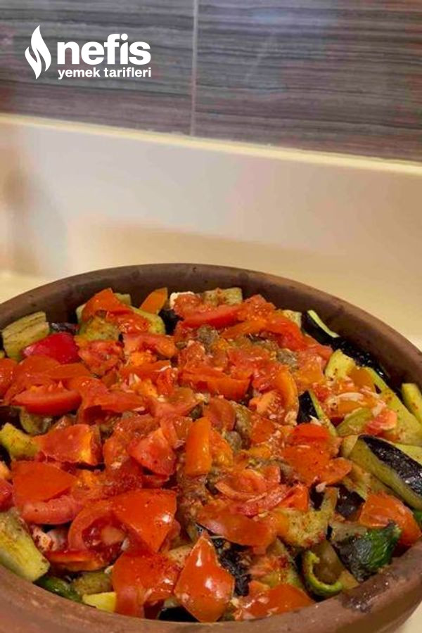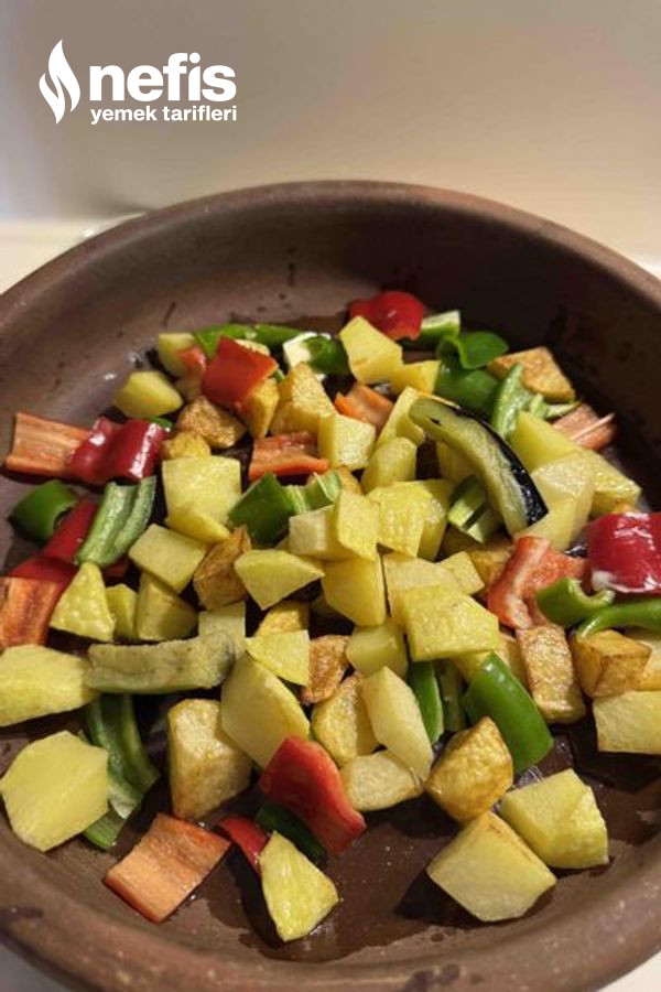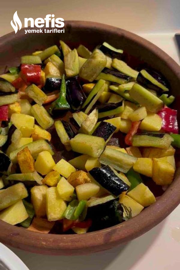 2. Patlıcanlar kızartılır ,küp küp doğranmış patatesler kızartılır ,biberler kesimlere ayrılır ,domatesler küp küp doğranır ,isteğe bağlı sarımsaklarda doğranabilir bütün de konulabilir.