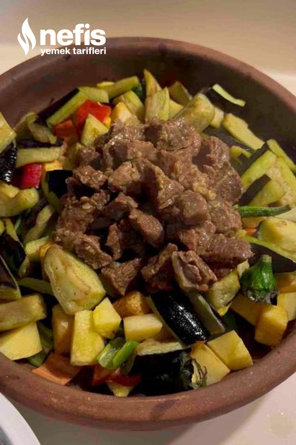 3. Güveç tepsisinin içerisine kızarmış sebzeler eklenir , doğranmış biberler ve sarımsak eklenir ,sebzeler tepsinin etrafına yerleştirilir , pişmiş olan et tepsinin tam ortasına gelecek formda yerleştirilir,etin suyu sebzelerin üzerine dökülür.