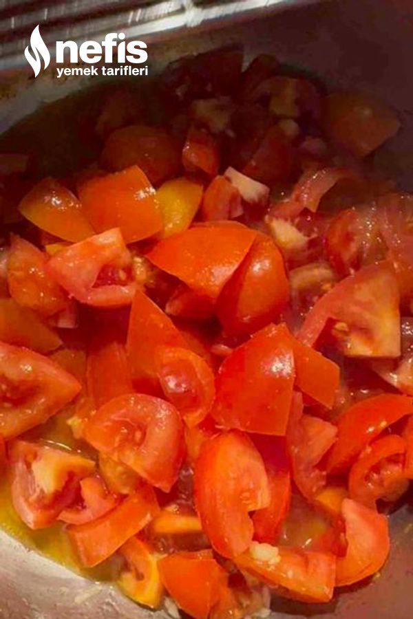 4. Kırmızıbiber ve kekik gezdirilir , az tavada sotelenen domateslerde en üstünü kaplayacak formda dökülür.