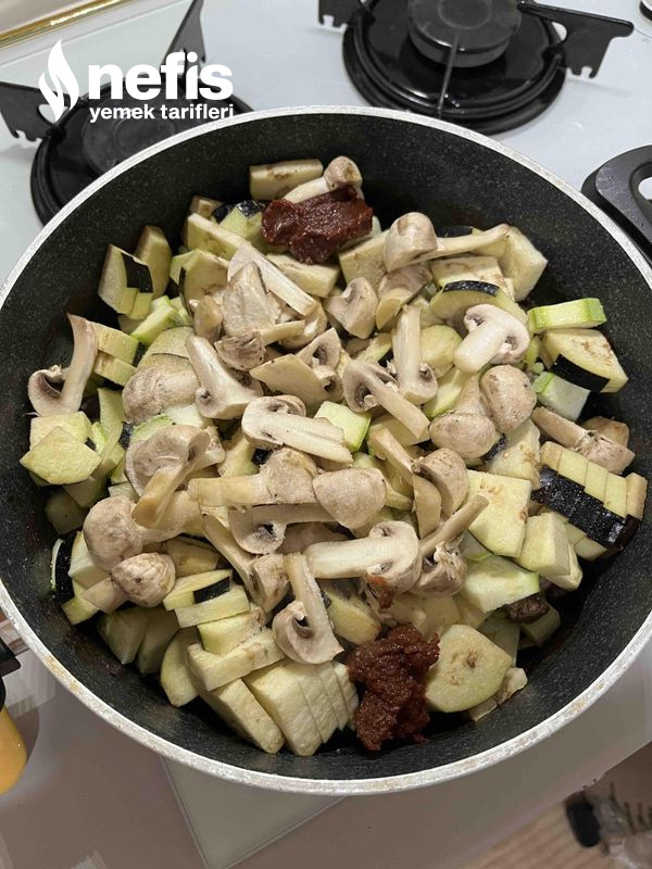 - Ardından yavaş yavaş küp küp kestiğimiz patates,biber,kabak,patlıcan ve mantarı ekleyip karıştırmadan tencerenin üzerini kapatıp sebzelerin sularını salmalarını bekliyoruz.