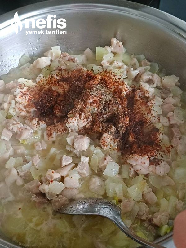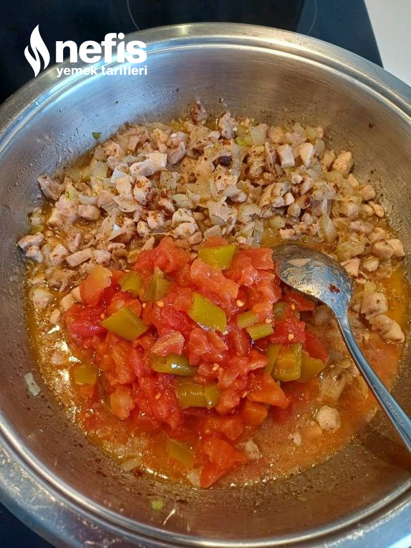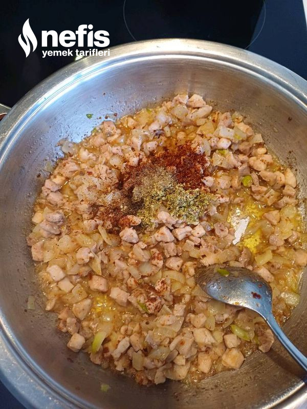 - Diğer taraftan tavaya aldığımız sıvı yağda minik doğranmış tavuklar suyunu çekinceye kadar kavuralım.