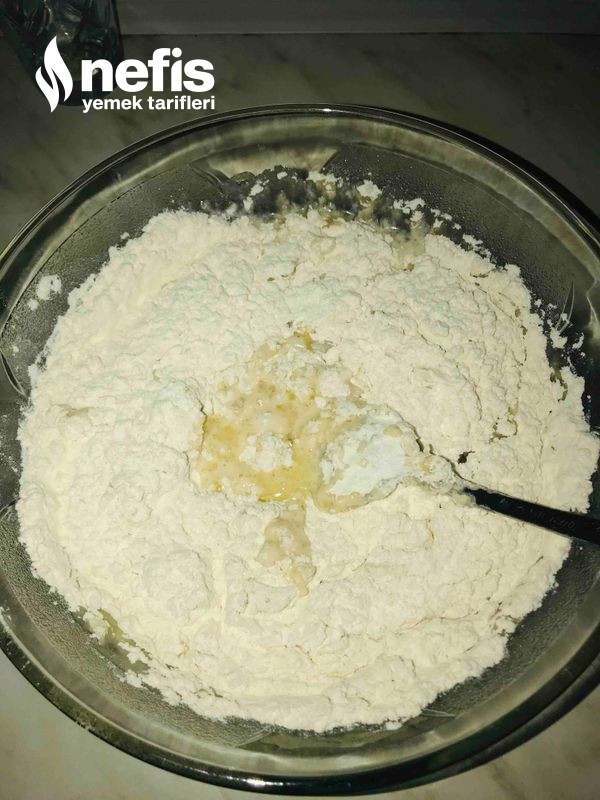 - Bütün malzemeyi kaba koyduktan sonra azar azar unu ekleyelim.