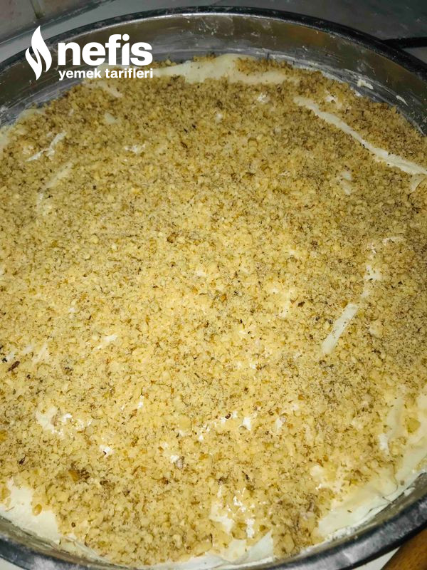 - Dinlenen hamurumuzu 18 beze ye ayırıp nişasta yardımıyla açmaya başlayalım 3 kat olarak ortalarına nişasta sürülerek açalım en alt kata 10 kat açtığımız yufkaları serip cevizimizi serpelim.
