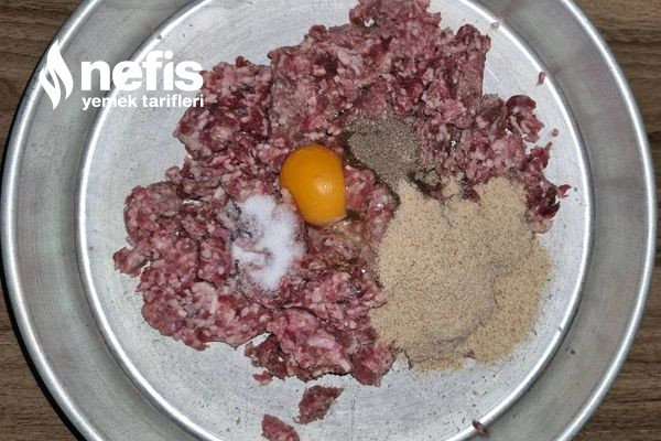 - Hamburger etimiz için kıyma, yumurta, galeta unu, tuz, karabiber ve karbonatı bir kaba alıp düzgünce yoğuruyoruz.