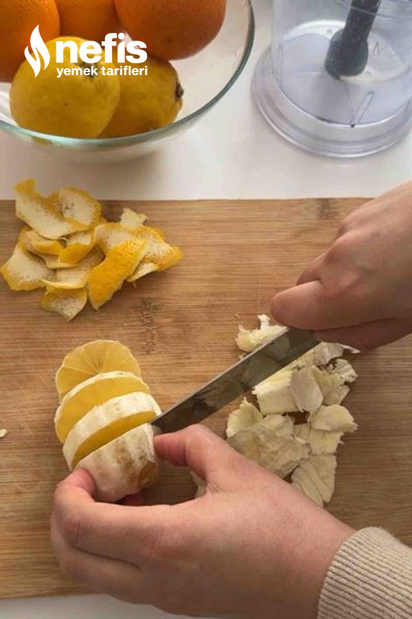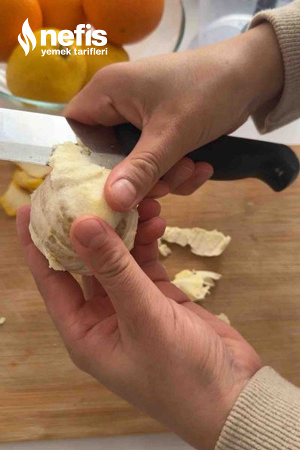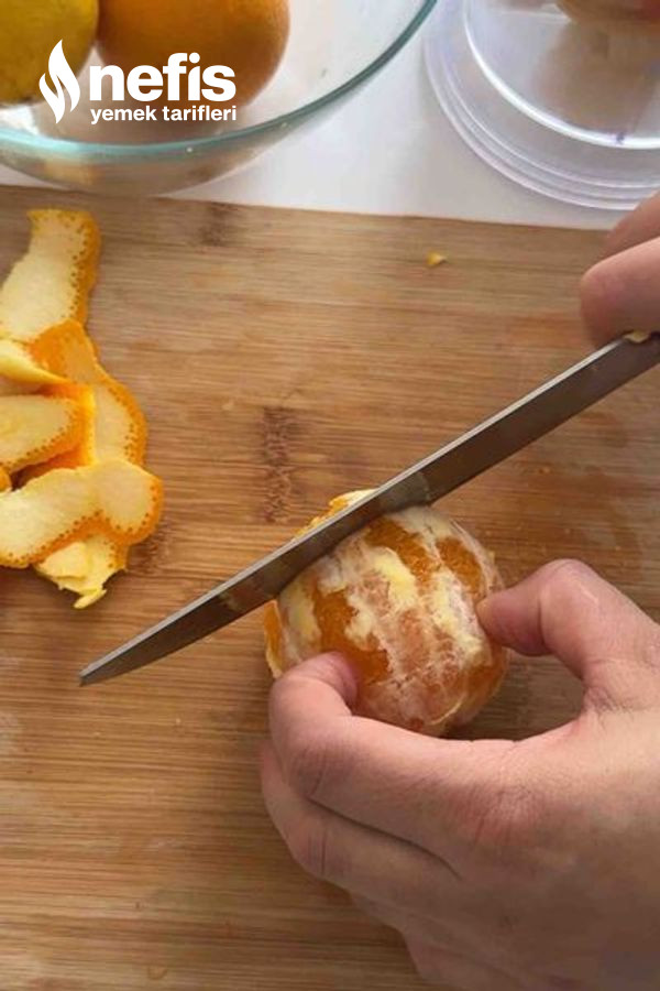 1. Limonları ve portakalları üzerindeki kabuk kısmını soy beyaz kısım kalsın kabukları kenara koy beyaz kısmı soyup çöpe atalım limonda beyaz kısım kalırsa acılık olur.