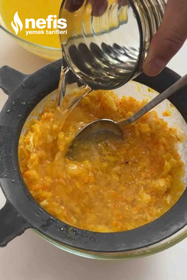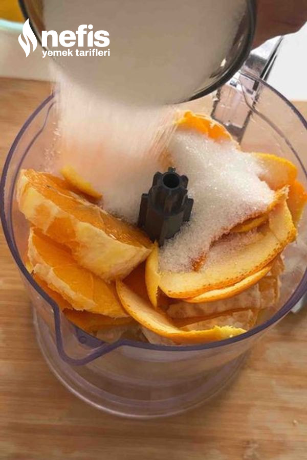 2. Kabuklarla birlikte limon ve portakalı doğrayıcıya koy üzerine şeker ekleyip, püre haline getir daha sonra süzgeçten geçir ve üzerine bir su bardağı su dök )daha rahat süzgeçten geçsin diye)