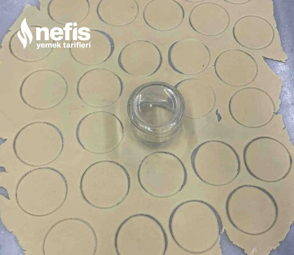 - Hamuru dörde bölüp oklava ile düzleştirelim. Kalın yani serçe parmak kalınlığından biraz daha az olmalıdır. Bir bardak yahut kavanoz ağzı ile yuvarlak biçimler verelim. İçi yağlanmış yahut içine fırın kağıdı serilmiş tepsiye dizelim.