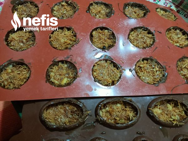 - 15 dakika kadar sonra kalıbımızı çıkaralım ortalarına hazırladığımız cevizli kadayıflı içten koyalım.