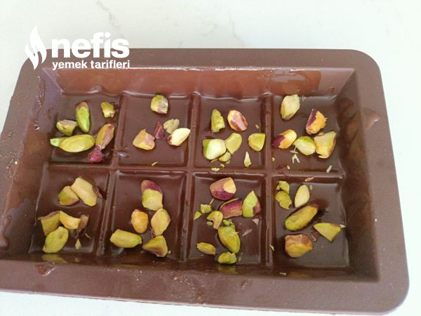 - Yine kare silikon kalıbın altına bir kat çikolata koyalım. Karelerin ortasına antep fıstığı koyalım. Dolaba koyalım donduktan sonra en üstüne tekrar bir kat eritilmiş çikolatadan koyup dolaba kaldıralım donduktan sonra kahvenin yanında yemeye hazır 😋.