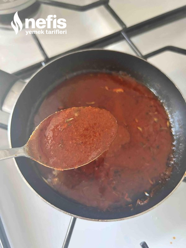 2. Sos için yağ ve salçayı kavuruyoruz ,üstüne baharatları ekleyip bir çay bardağı suyu ekliyoruz. Sosu 1-2 dakika kaynatıyoruz.