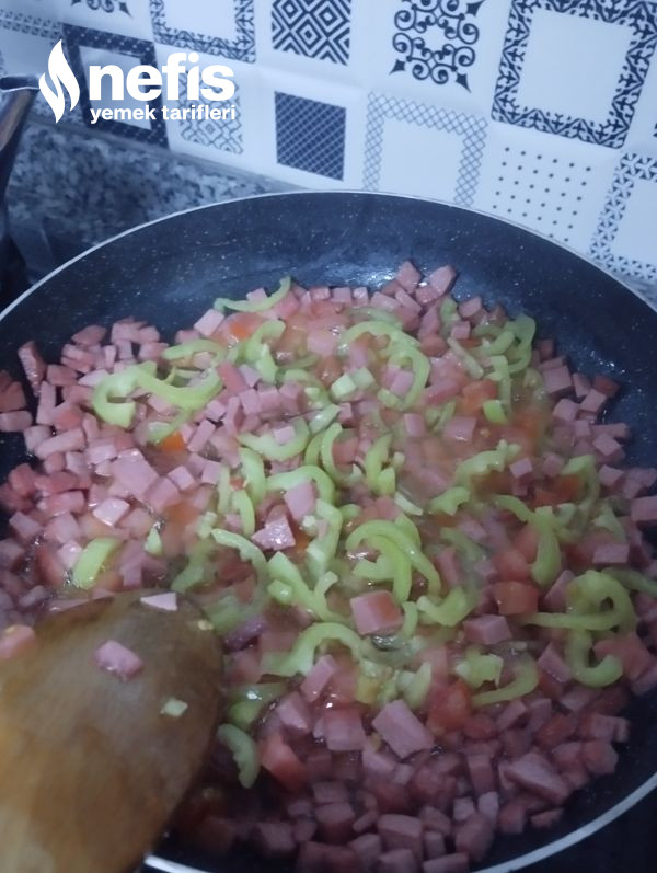 9. Biber biraz piştikten sonra salamı ekleyelim. O da biraz kavrulduktan sonra domatesi ek edebilirsiniz.