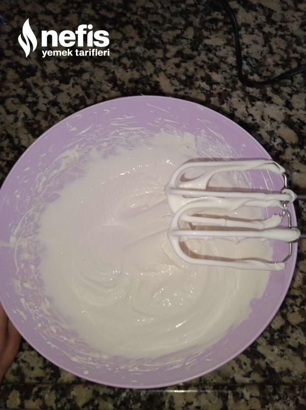 4. Mikserle yahut mutfak robotuyla yüksek periyotta, krem şanti kabarana ve sert tepecikler oluşana kadar çırpın. Yaklaşık 5 -6 dakika sürer.