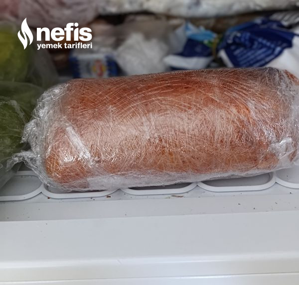 4. Karıştırdıktan sonra streç filmize tavuklarımızı bir sucuk yada sosis üzere sarıyoruz, sardıktan sonra ben buzdolabında 2 saat 15 dk beklettim hoş dondu donmazsa siz fazla bekletebilirsiniz.