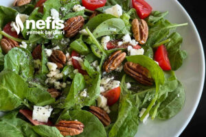 - Kırıp ikiye böldüğümüz pikan cevizlerini de salatamızın üzerine serpiştirelim.