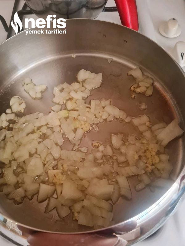 - Tencereye yağ ekleyip biraz ısıtalım sonra doğradığımız soğanları ve sarımsağı atalım.