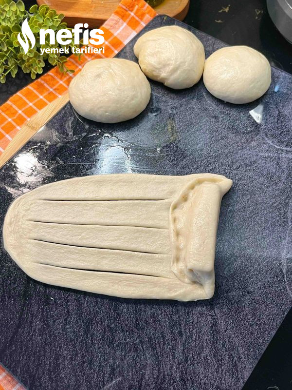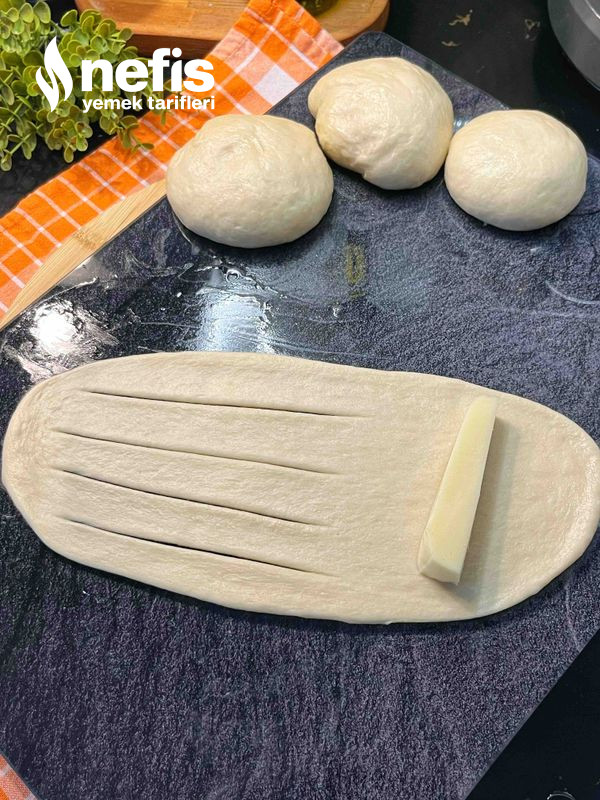 - Merdane ile uzun biçimde açalım. Uç kısmına kaşar koyup bir bıçak ile şeritler keselim.