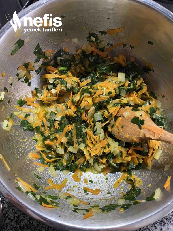 3. Soğanlar ve havuçlar ölünce üzerine ince ince doğradığımız ıspanakları ekleyelim ve birkaç dakika kavuralım.