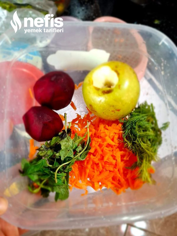 - Kırmızı pancar ve havucu soyuyoruz. Elmayı da isteyenler soyabilir ancak ben besin kıymetlerinden en çok yarar sağlamak için kabuklu kullandım. Kırmızı pancar, havuç ve elmayı rendeliyoruz.