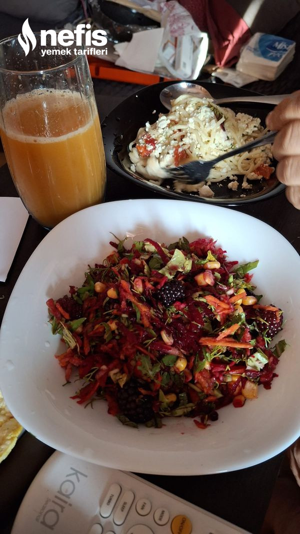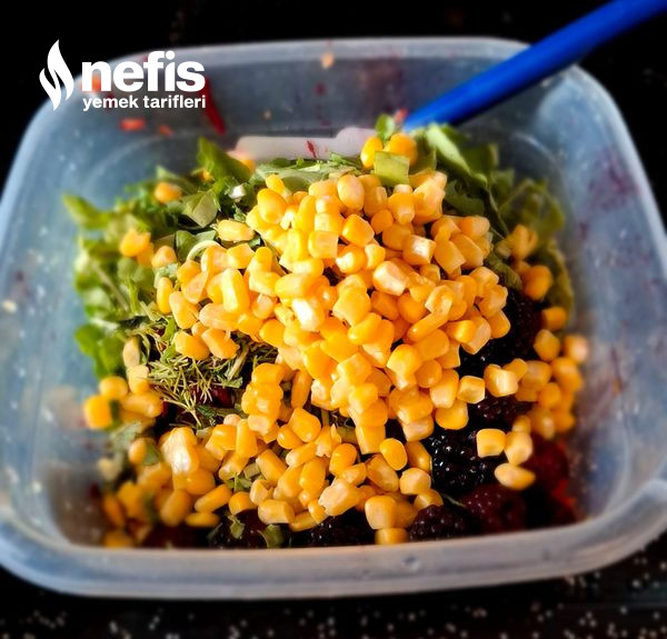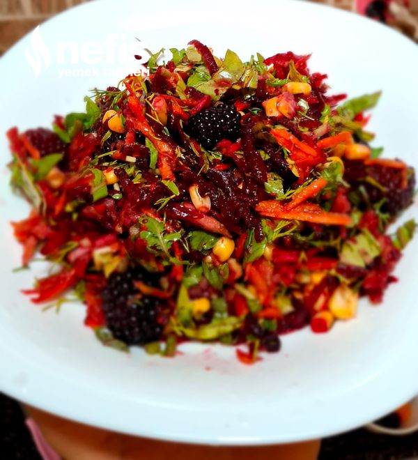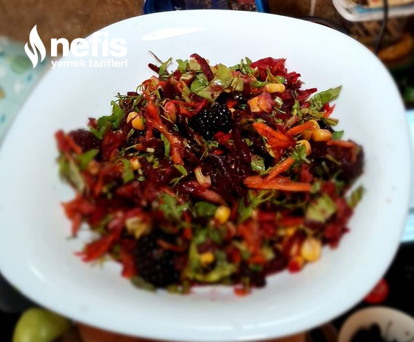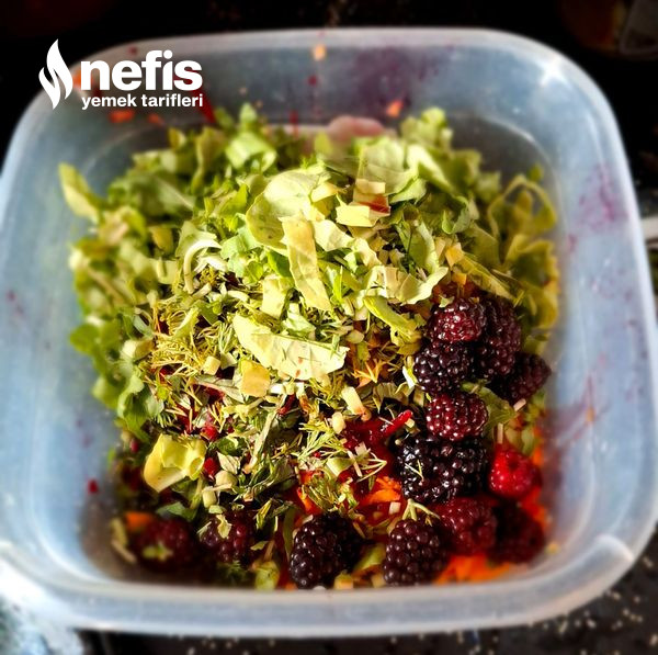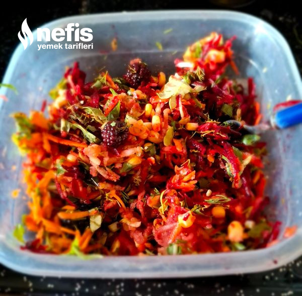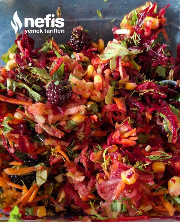 - Derin bir kabın içine pancar, havuç, roka, dereotu, nane, böğürtlen ve mısırı ekliyoruz. Düzgünce karıştırıyoruz.