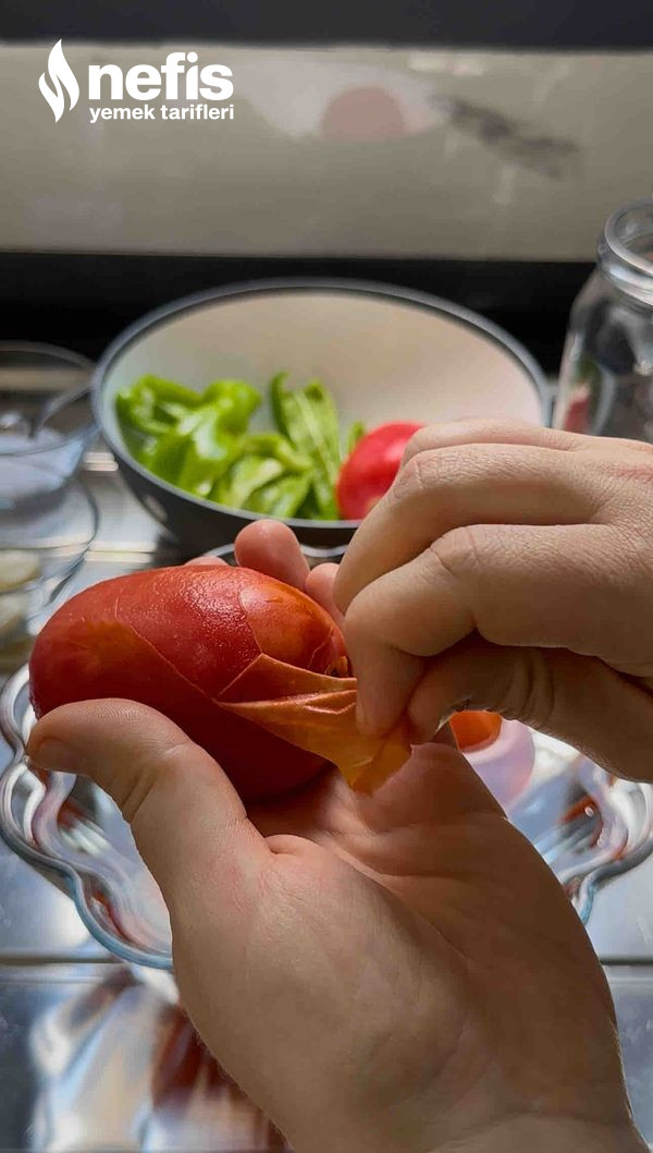 - Domateslerin kabuklarını soyuyoruz. Ben alt kısımlarına çizik atıp yaklaşık 1 dk kaynar suda bekletip soğuk suya aldım. O halde kabukları kolay kolay soyuldu. İsteyen bıçakla da soyabilir.