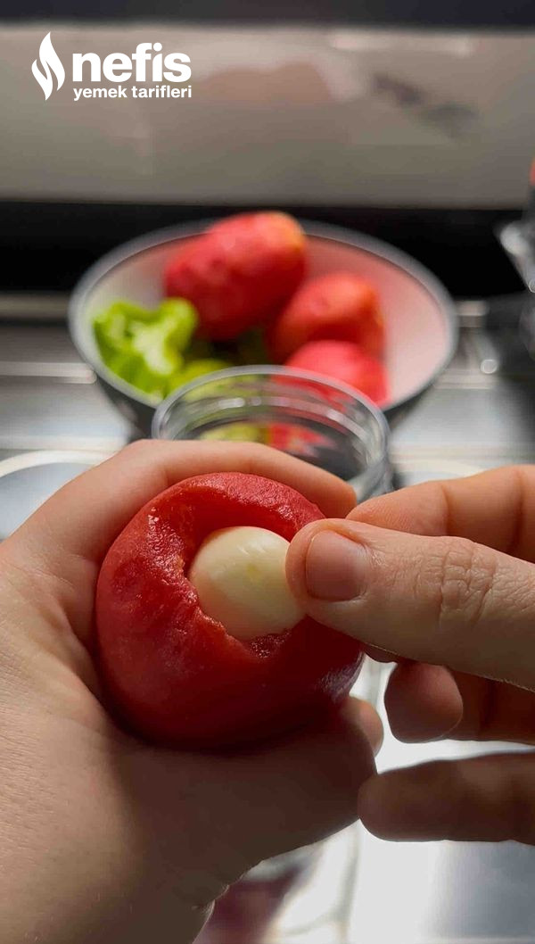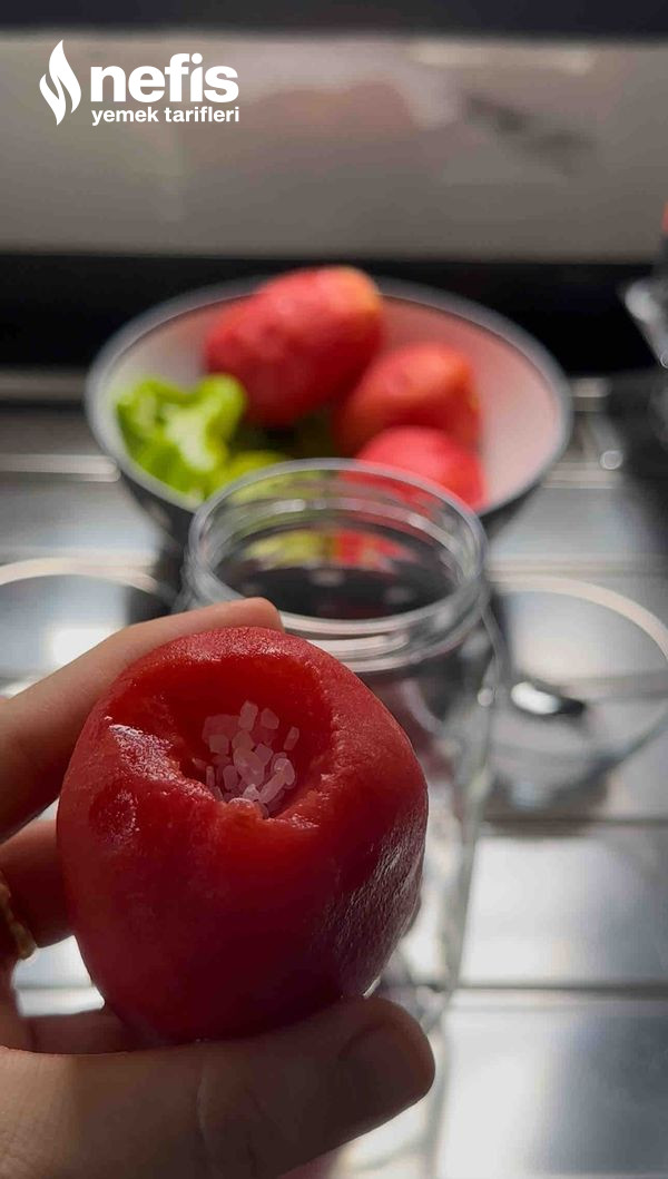 - Soyduğumuz domateslerin baş kısmına ufak bir oyuk açıyoruz. Yarım çay kaşığı kaya tuzu ve sarımsağı sıkıştırıp kavanoza koyuyoruz.