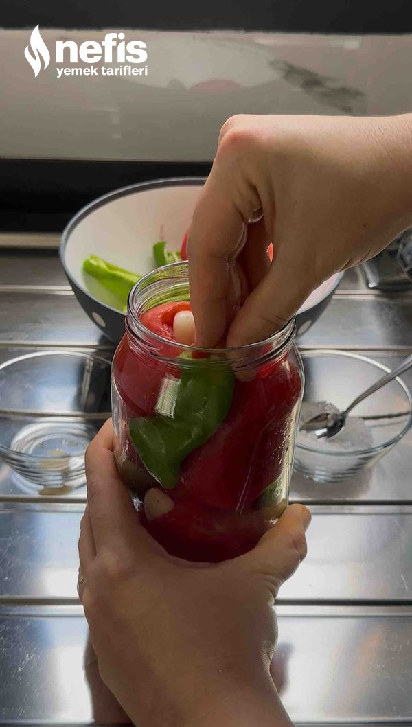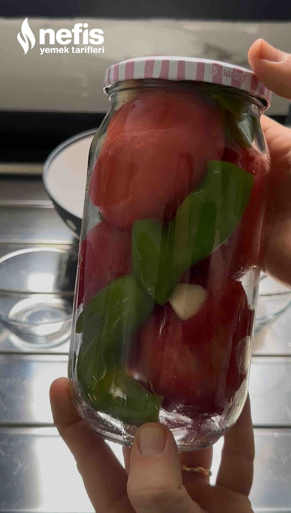 - Domateslerin büyüklüğüne nazaran kavanozun aldığı domates sayısı değişiyor. Ben 1 litrelik kavanoza 5 adet domates sığdırabildim. Boş kalan yerlere de köy biberi sıkıştırıp kapağını sıkıca kapatıyoruz.