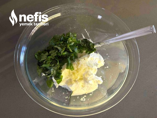 3. Süzme yoğurt, tuz, sarımsak, doğranmış fesleğen yaprakları ve kavrulan bademleri karıştırın.