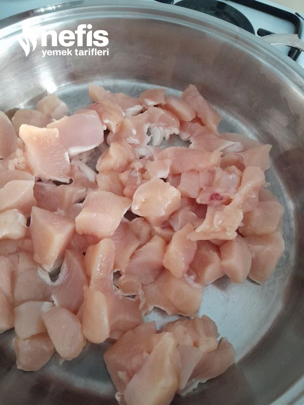 - Tavukları küp biçiminde doğrayalım, kızgın tavada pişirelim.