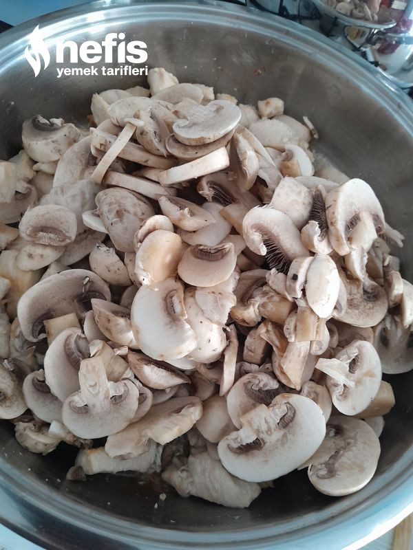 - Tavuklar pişince üzerine yağ ekleyip ,doğradığımız mantarı ve rendelenmiş sarımsağı ekleyelim mantarlar pişene kadar kavuralım ve biraz tuz ekleyelim.
