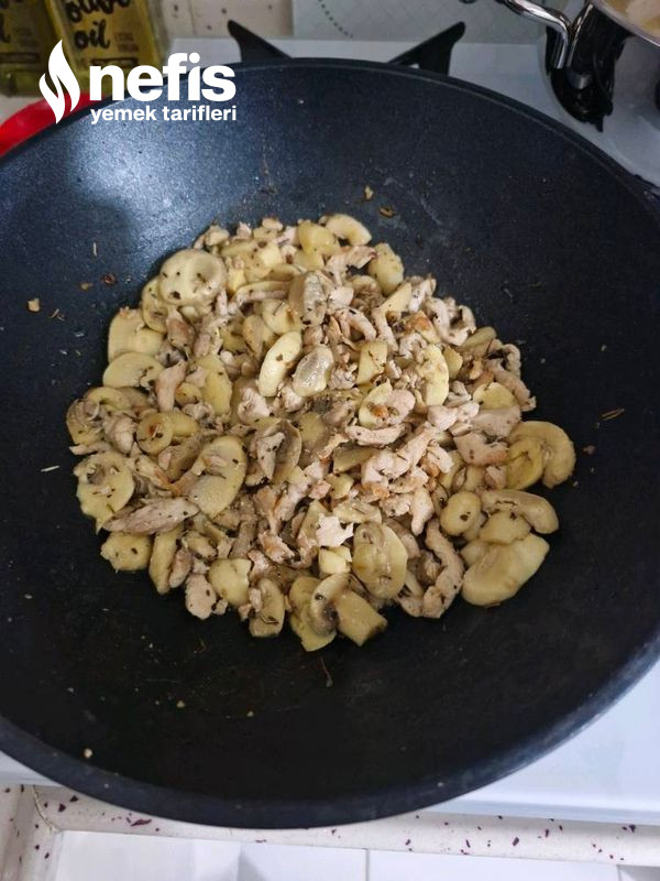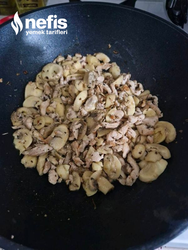 3. Pişen tavukların üzerine fesleğeni ,karabiberi ,tuzu katalım, en sonda konserve mantarı koyalım şayet taze mantar kullanacaksanız ince doğrayıp katabilirsiniz 10 adet kadar kâfi olur. Fakat tavsiyem konserve mantar kullanmanız zira daha lezzetli oluyor ve sulanmıyor.