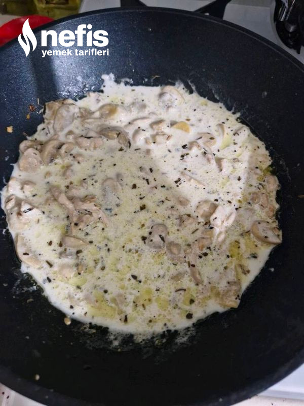 4. 2 dk kadarda mantarla birlikte kavrulan tavukların üzerine 1 paket krema ekleyelim ve sütü ekleyelim kaynayana kadar çektirelim.