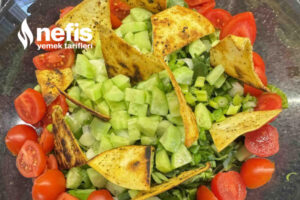 - Sosladığımız salatayı karıştırdıktan sonra, kızarttığımız lavaşlar ile süslüyoruz.