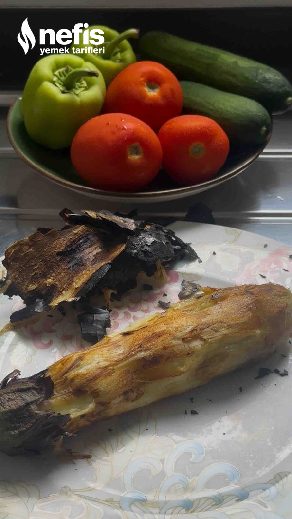 - Patlıcanı közleyip sapını kesmeden kabuğunu temizleyin.