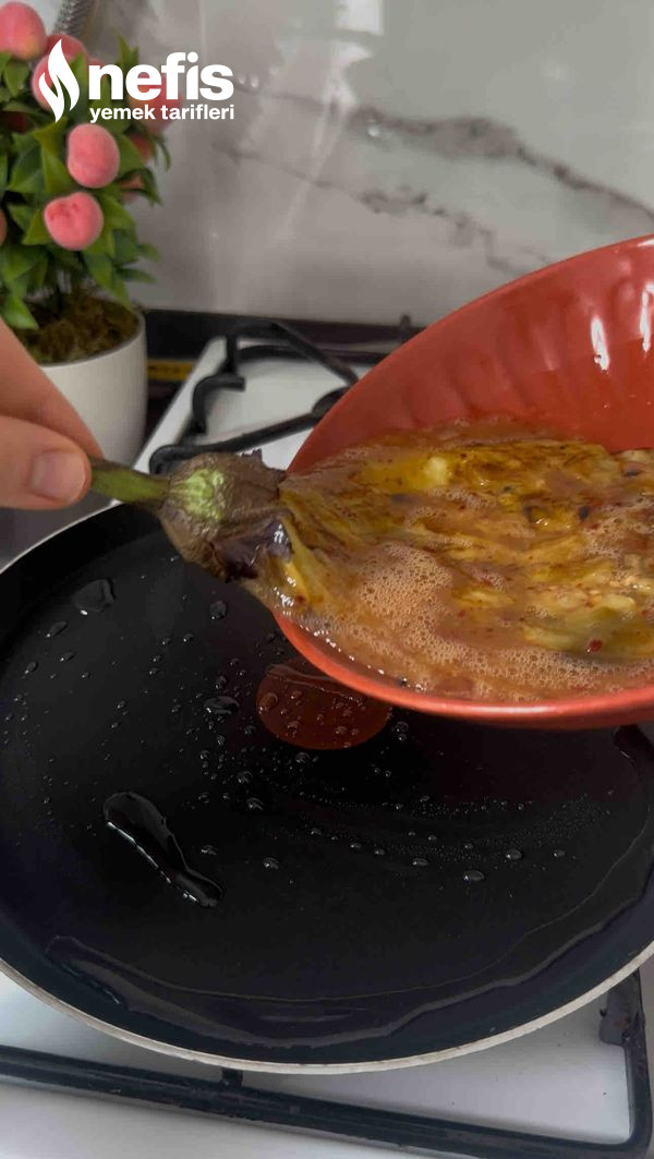 - Közlenmiş patlıcanı yumurta çırptığımız tabağa alıp parçalamadan ezelim.