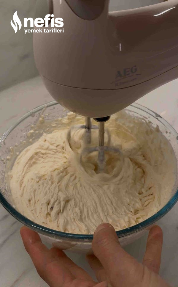 - Pastanın kreması için; bütün materyalleri karıştırma kabına alıp koyu kıvam alana kadar çırpın.