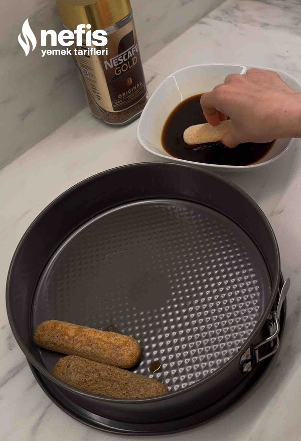 - Bisküvileri 1-2 saniye kahveye batırıp, çıkarın ve kalıba dizin.