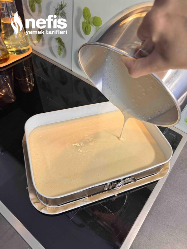 5. Yağlı kağıtlı kelepçeli dörtgen kek kalıbına kek hamurunu dökün.