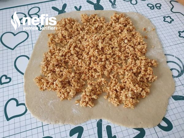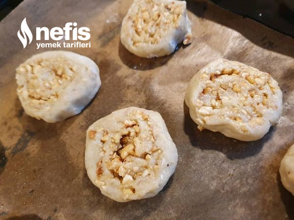 3. İç harcı için, fındık ince çekilir tüm iç gereçler karışıtırılır, açılmış hamura yayılır ve rulo formunda sarılır, parmak kalınlığı kesilir.