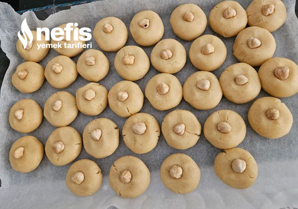 - Yoğurduğumuz hamurdan ceviz büyüklüğünde modüller koparıp yuvarlanıp üzerine fındığımızı üzerine yavaşça bastırıp koyuyoruz hamur bitene kadar sürece devam ediyoruz.