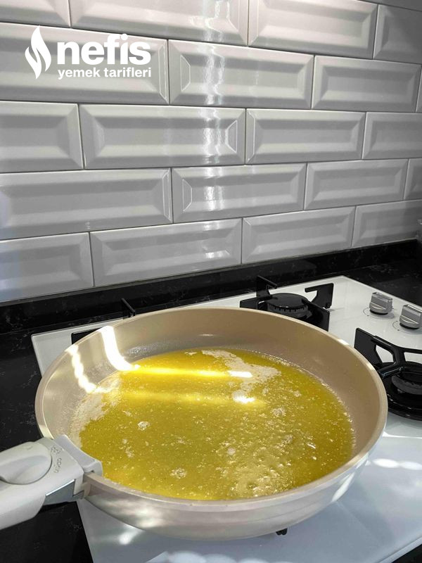 - Helvamızı yapacağımız derin tavaya tereyağ ve sıvı yağımızı koyup ocağımızı açıyoruz.