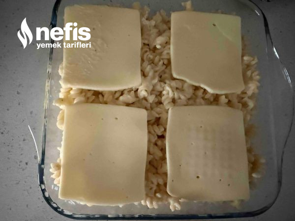 6. Kalan yarısını dökelim ,üzerine ister dilim kaşar isterseniz rendelenmiş kaşar koyun.