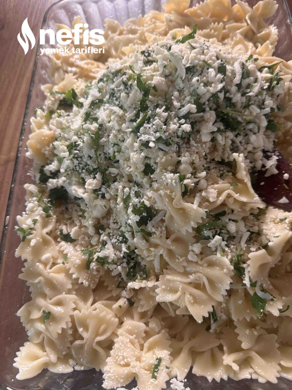 - Daha sonra tepsiye alalım, tüm peynir ve maydanoz uygunca karıştırıp makarnaya ekleyip düzgünce tekrar karıştıralım.